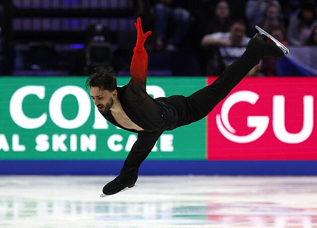 Český krasobruslař Georgii Reshtenko během krátkého programu na MS v Praze.