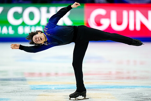 Šun Sato při volné jízdě na světovém šampionátu v krasobruslení v Praze.