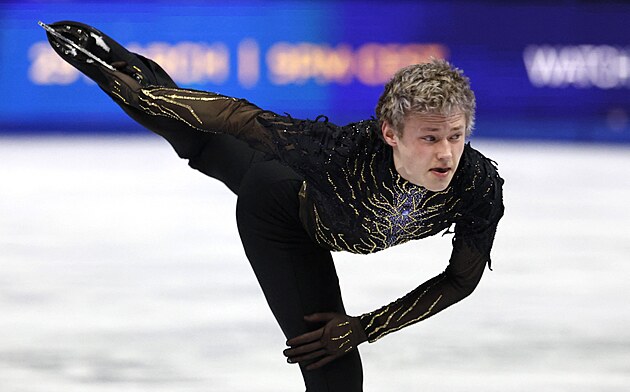Estonec Aleksandr Selevko během své volné jízdy na MS v krasobruslení v Praze, 28. března 2026.