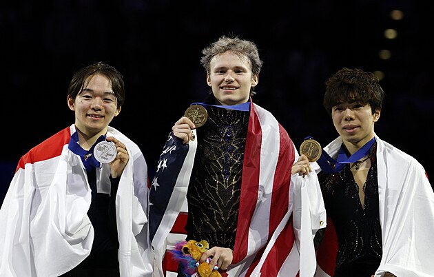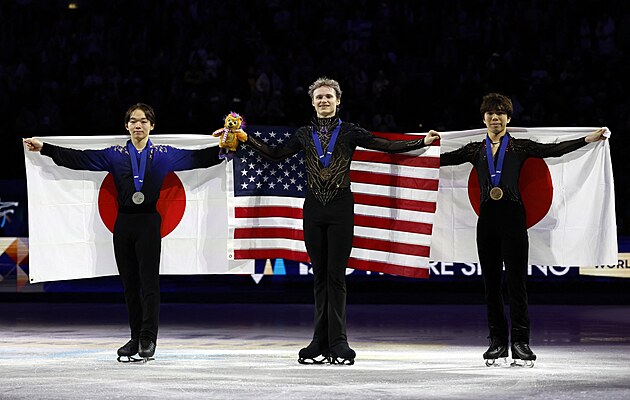 Medailisté ze soutěže mužů na pražském mistrovství světa v krasobruslení: vlevo stříbrný Juma Kagijama z Japonska, vpravo jeho bronzový krajan Šun Sato a mezi nimi americký fenomén Ilia Malinin