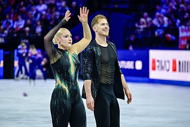 Čeští krasobruslaři Filip a Natálie Taschlerovi zdraví diváky po svém nevydařeném vystoupení ve volných tancích na domácím mistrovství světa v Praze.