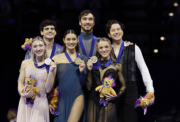 Medailisté ze soutěže tanečních párů na krasobruslařském MS v Praze. Zlaté Laurence Fournierovou Beaudryovou s Guillaumem Cizeronem z Francie doplňují stříbrní Kanaďané Piper Gillesová s Paulem Poirierem (vlevo) a bronzoví Američané Emilea Zingasová s Vadymem Kolesnikem (vpravo).