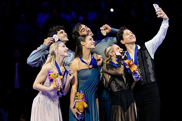 MEDAILOVÉ SELFIE NA ZÁVĚR ŠAMPIONÁTU. Pódium soutěže tanečních párů na krasobruslařském MS v Praze. Zlaté Laurence Fournierovou Beaudryovou s Guillaumem Cizeronem z Francie doplňují stříbrní Kanaďané Piper Gillesová s Paulem Poirierem (vlevo) a bronzoví Američané Emilea Zingasová s Vadymem Kolesnikem (vpravo).