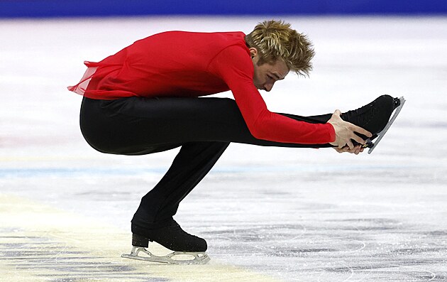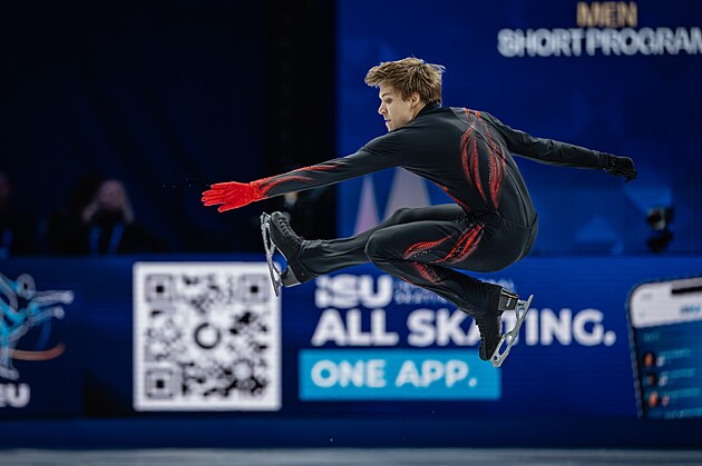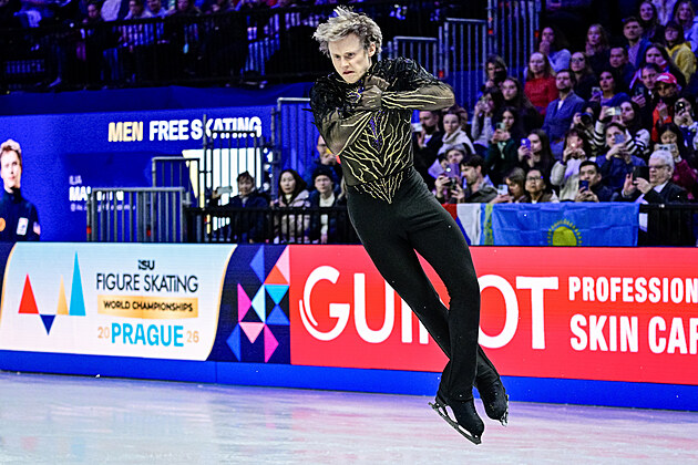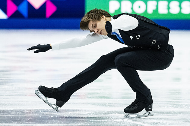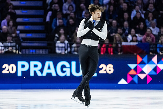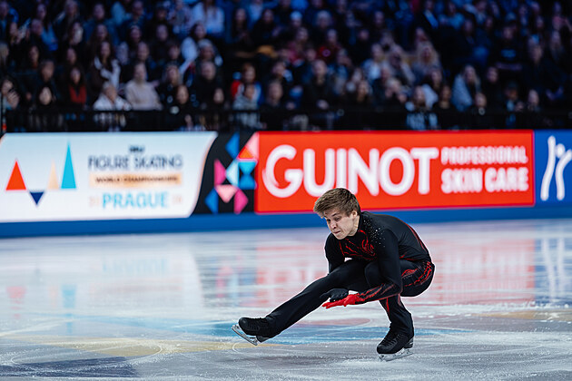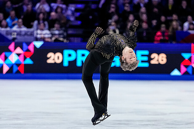 Ilia Malinin z USA během své volné jízdy na MS v krasobruslení v Praze, 28. března 2026.