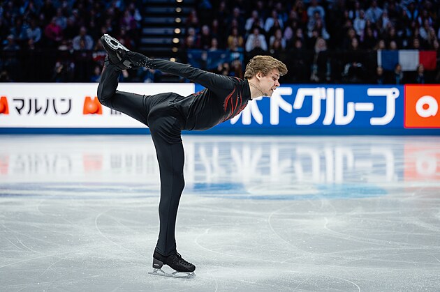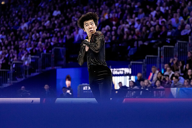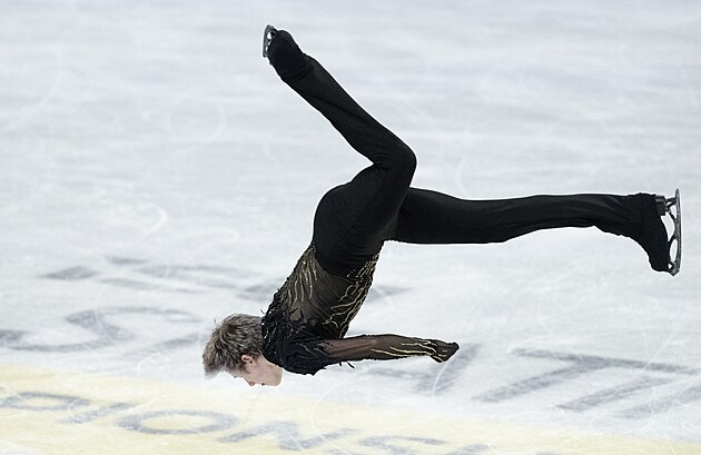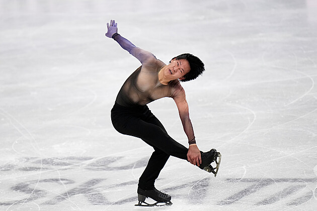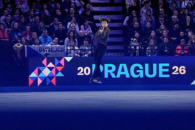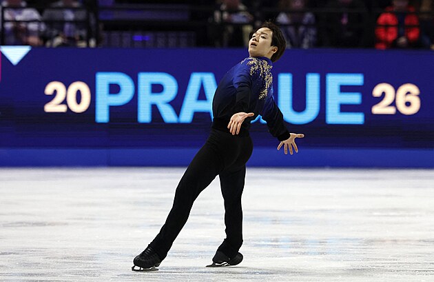 Japonský krasobruslař Šun Sato při volné jízdě na mistrovství světa v Praze.