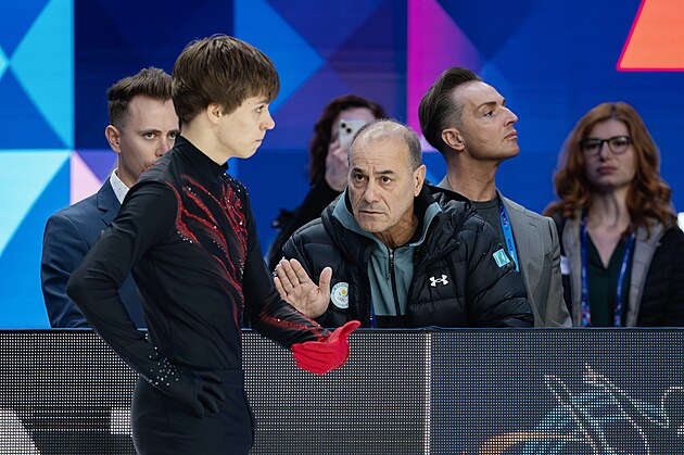 Rafael Arutjuňan dává poslední rady Georgiimu Reshtenkovi před krátkým programem na MS v Praze.