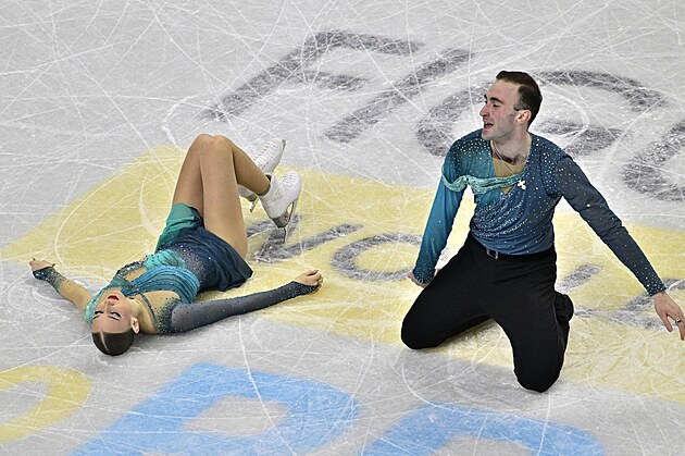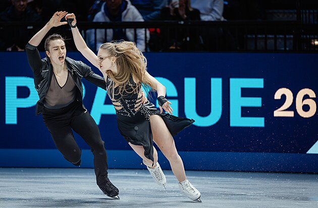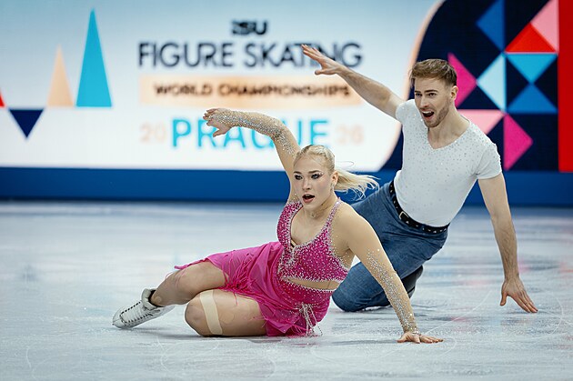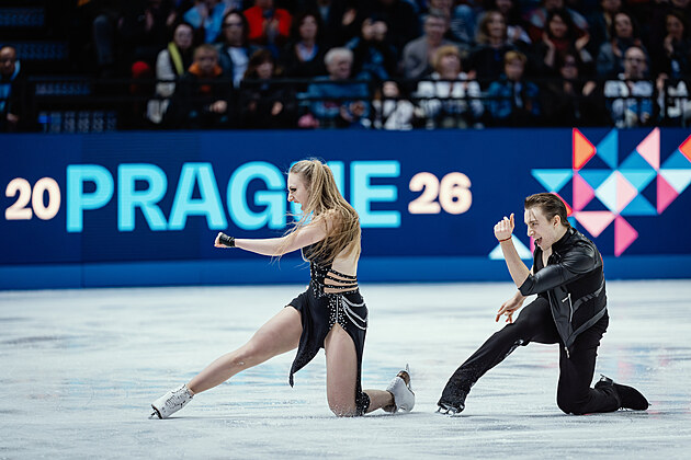 Čeští krasobruslaři Filip a Natálie Taschlerovi během vystoupení ve volných tancích na mistrovství světa v Praze