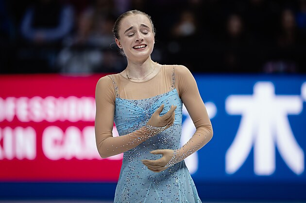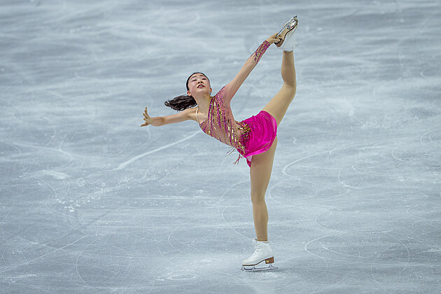 Mone Čibová během krátkého programu na světovém šampionátu v krasobruslení v Praze.