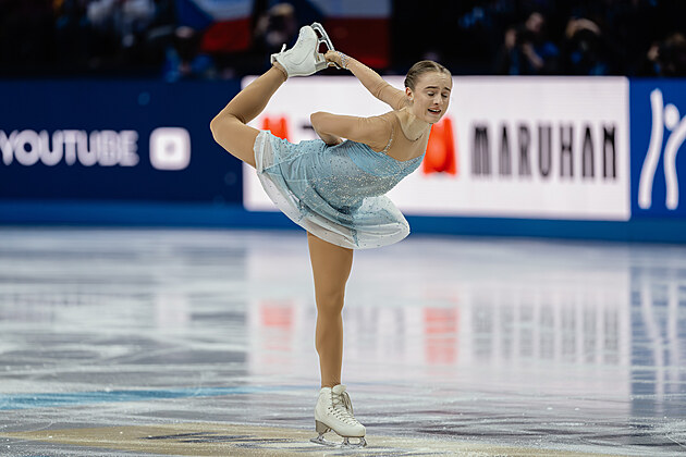 Eliška Březinová během nedělní exhibice na MS v krasobruslení, 29. března 2026.