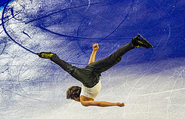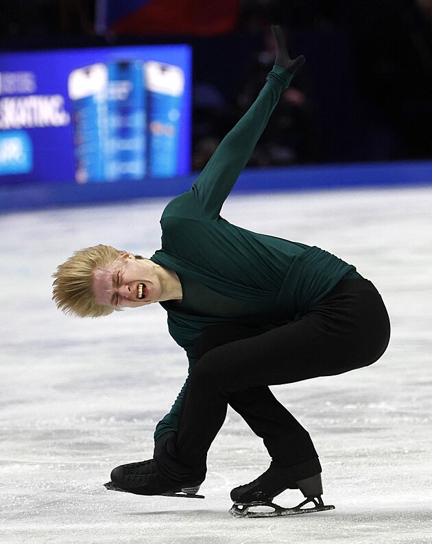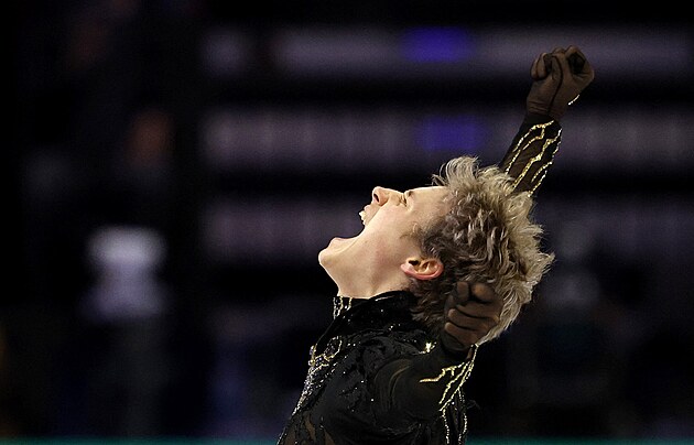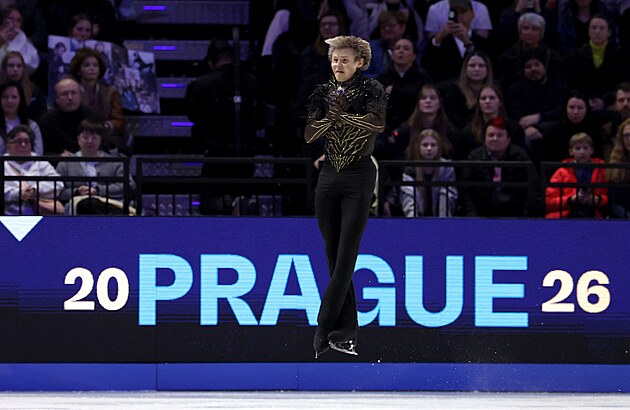 Americký krasobruslař Ilia Malinin během své volné jízdy na mistrovství světa v Praze zářil
