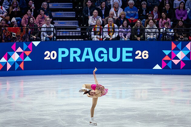 Kaori Sakamotová během krátkého programu na světovém šampionátu v krasobruslení v Praze.