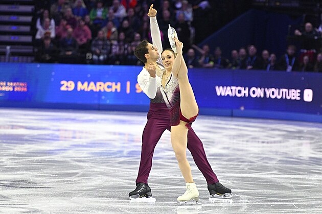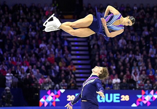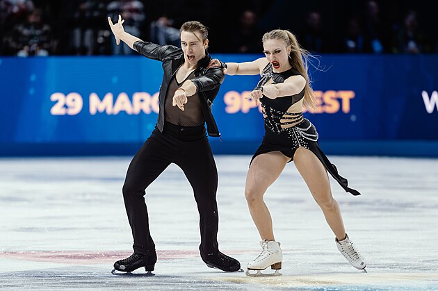 Maria Pavlovová a Alexej Sviatchenko z Maďarska během nedělní exhibice na MS v krasobruslení, 29. března 2026.