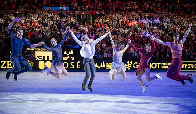 Mistři světa z letošního MS v krasobruslení v Praze. Zleva Nikita Volodin, Minerva Fabienne Haseová, Ilia Malinin, Kaori Sakamotová, Laurence Fournierová Beaudryová a Guillaume Cizeron.