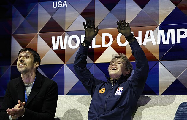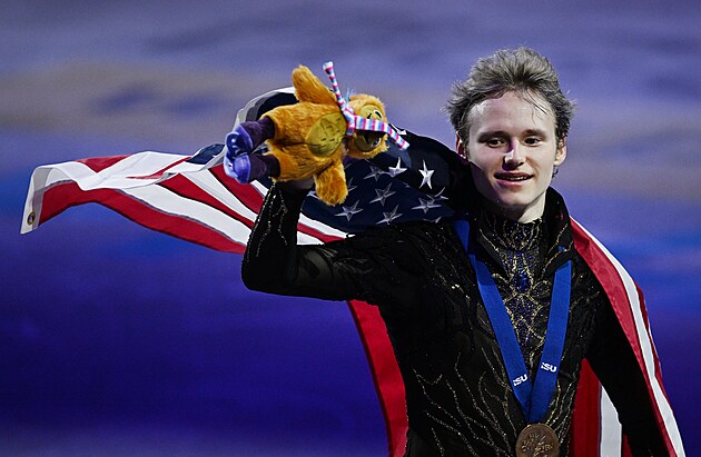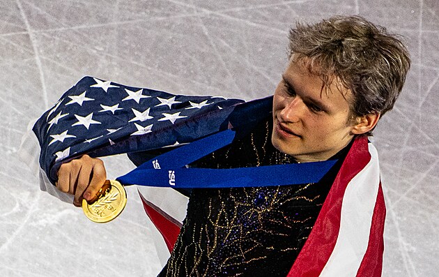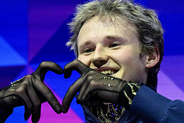 Šťastný Ilia Malinin po vítězství na MS v krasobruslení v Praze, 28. března 2026.