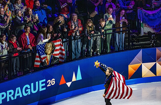 Americký krasobruslař Ilia Malinin z lóže mává divákům O2 areně, v Praze se raduje ze třetího titulu mistra světa v řadě.