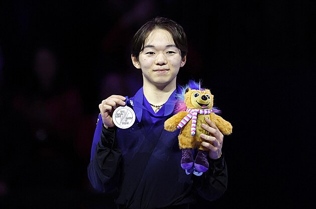 Japonec Juma Kagijama se těší ze stříbrné medaile na MS v krasobruslení v Praze, 28. března 2026.
