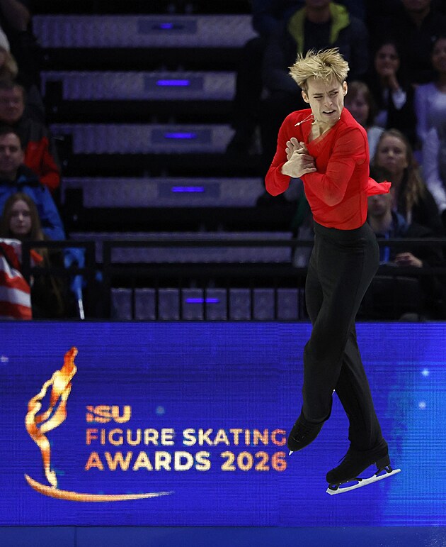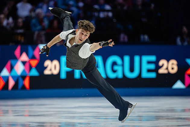 Američan Ilia Malinin na krasobruslařském MS v Praze zářil, 28. března 2026.