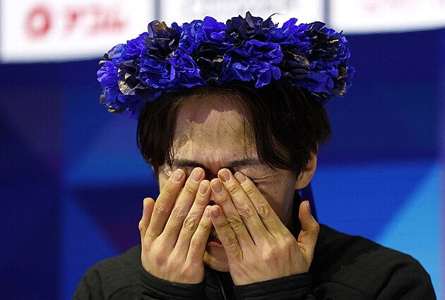 Emoce japonského krasobruslaře Jumy Kagijamy po vynikající volné jízdě na mistrovství světa v krasobruslení v Praze