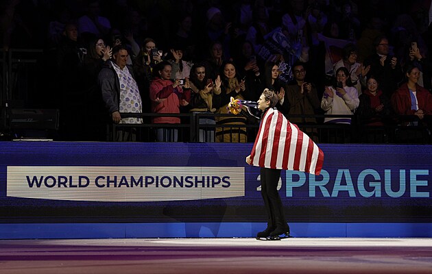 Ilia Malinin slaví v O2 areně titul mistra světa v krasobruslení, 28. března 2026.