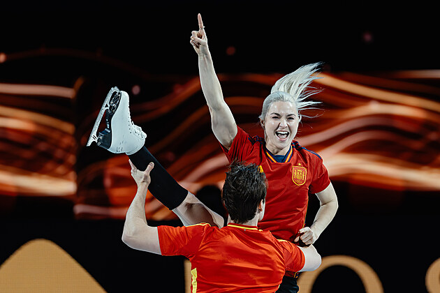 O vzruch se v O2 areně při závěrečné exhibici postaral taneční pár Olivia Smartová, Tim Dieck. Na ledovou plochu vyjel ve španělských fotbalových dresech, 29. března 2026.