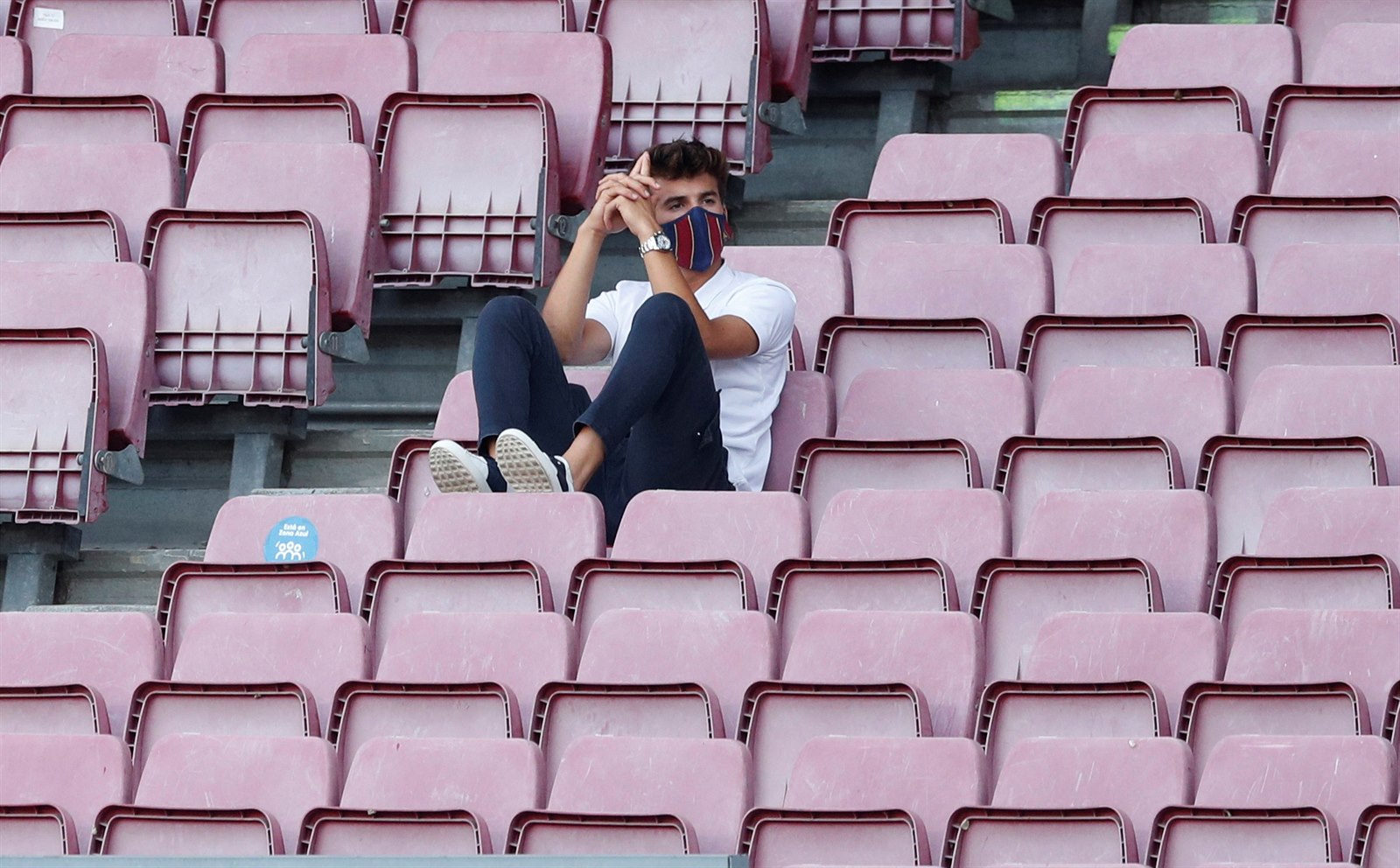 Mladíček Riqui Puig na tribuně během přípravného duelu proti Elche.