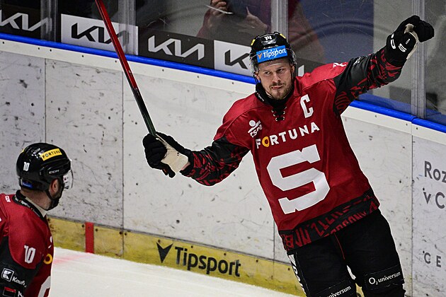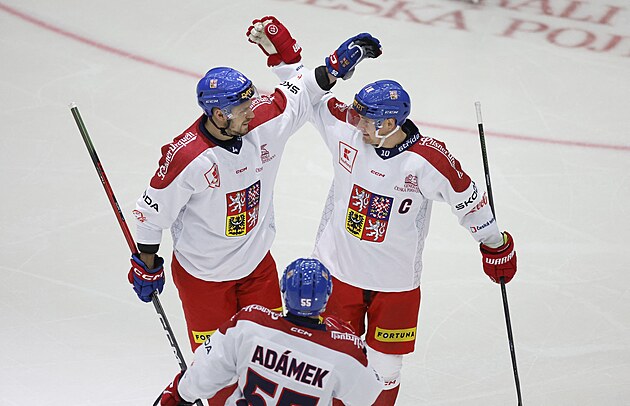 Ke gólu si gratulují Filip Chlapík a Roman Červenka (vpravo), přijíždí k nim Martin Adámek.