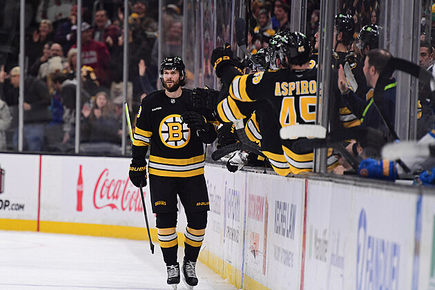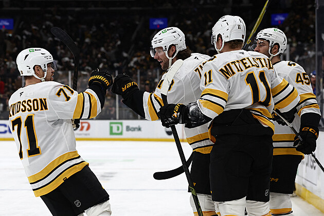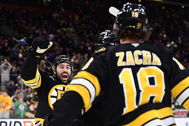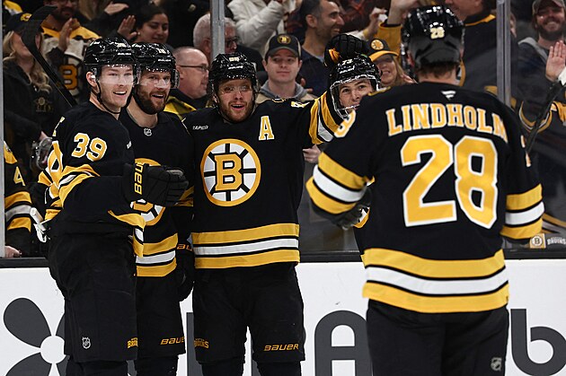 Bostonský útočník Pavel Zacha slaví se spoluhráči vstřelený hattrick.