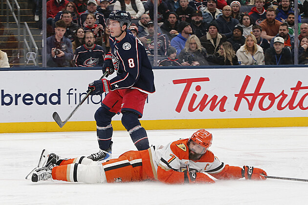 Radko Gudas z ledu přihlíží brance Zacha Werenskiho.