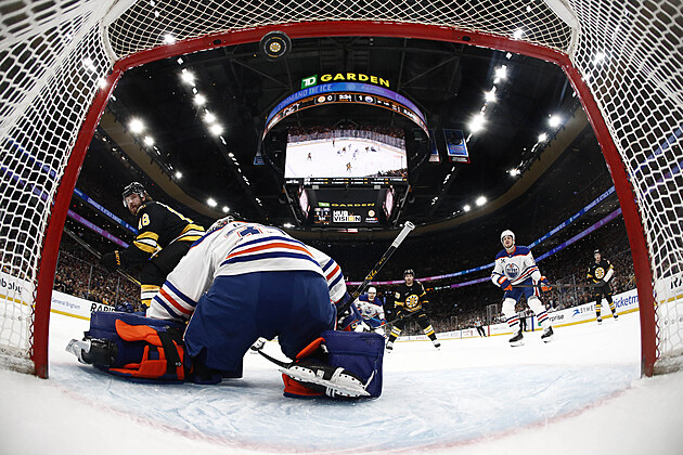 Pavel Zacha (18) z Boston Bruins skóruje v zápase s Edmonton Oilers, překonaným je Tristan Jarry.