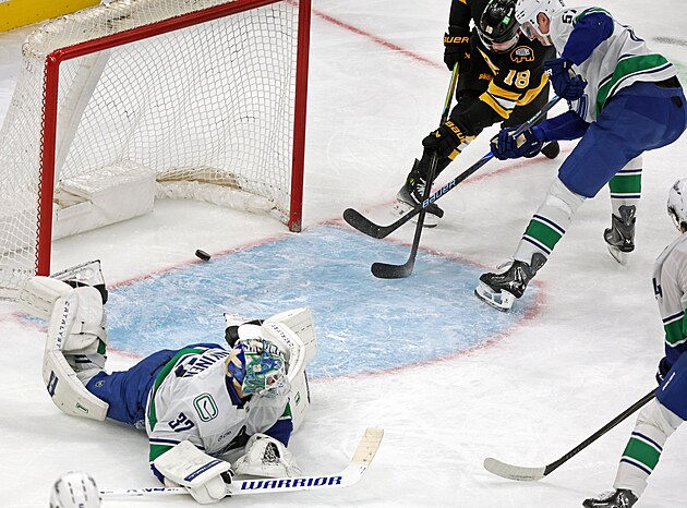 Pavel Zacha z Bostonu skóruje do odkryté branky Vancouveru.