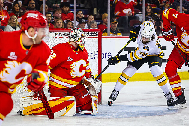Pavel Zacha (18) z Boston Bruins zakončuje v zápase s Calgary Flames o betonu Dustina Wolfa.