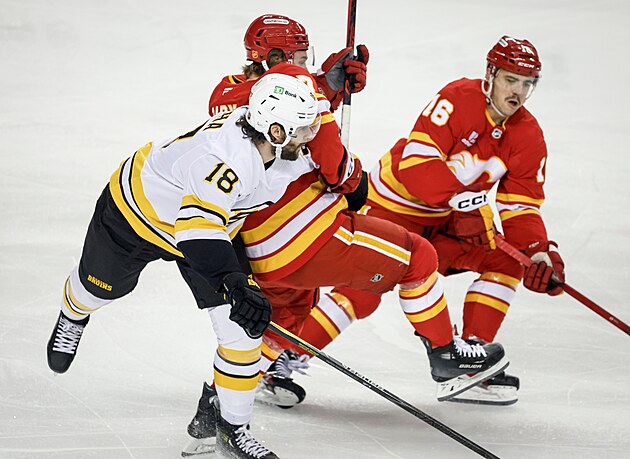 Pavel Zacha (vlevo) z Boston Bruins se přetlačuje s Connorem Zarym z Calgary Flames.