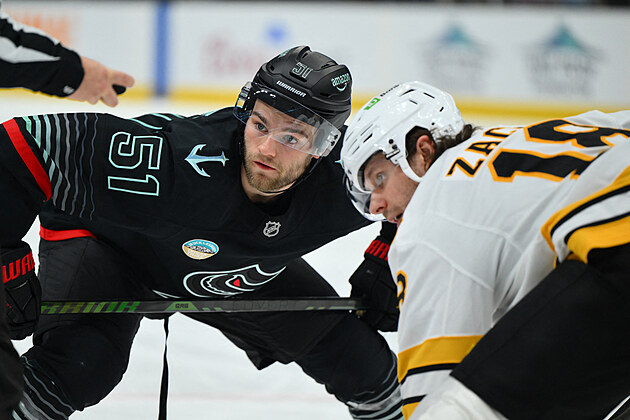 Shane Wright se soustředí na vhazování proti Pavlu Zachovi.