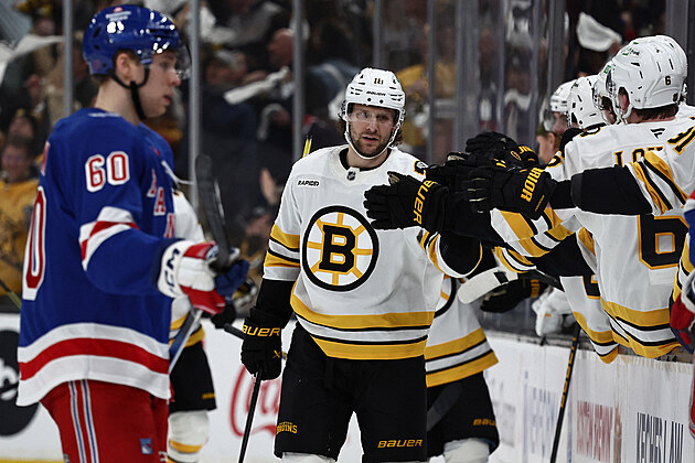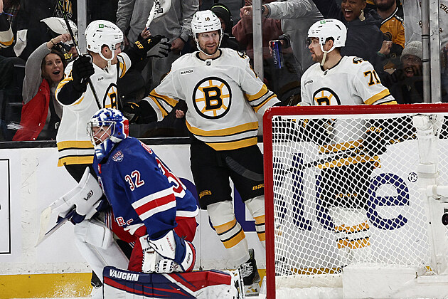 Bostonský útočník Pavel Zacha slaví se spoluhráči vstřelený hattrick v utkání proti New Yorku Rangers.