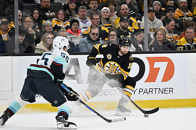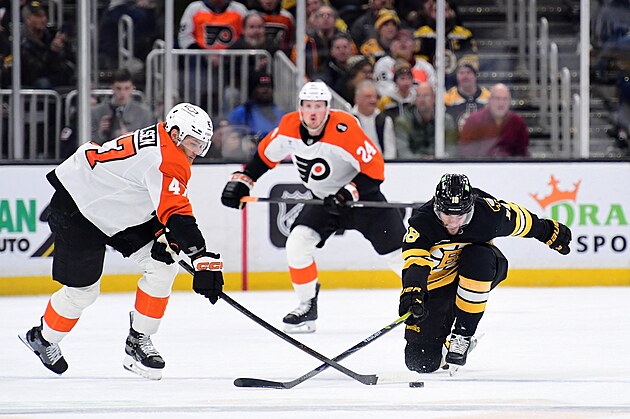 Pavel Zacha (18) z Boston Bruins v zápase s Philadelphia Flyers. Sleduje ho Travis Konecny.