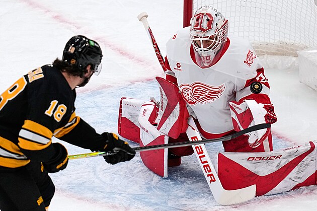 Pavel Zacha (18) z Boston Bruins zakončuje na Cama Talbota z Detroit Red Wings.