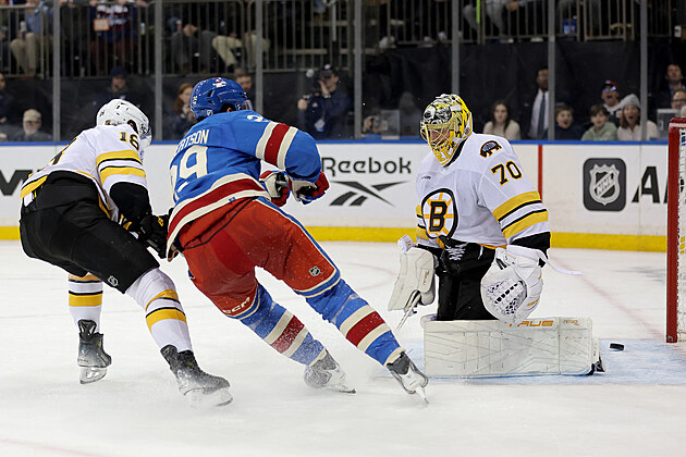 Pavel Zacha z Boston Bruins (vlevo) přihlíží, jak Matthew Robertson z New York Ranger překonává brankáře Joonase Korpisala.