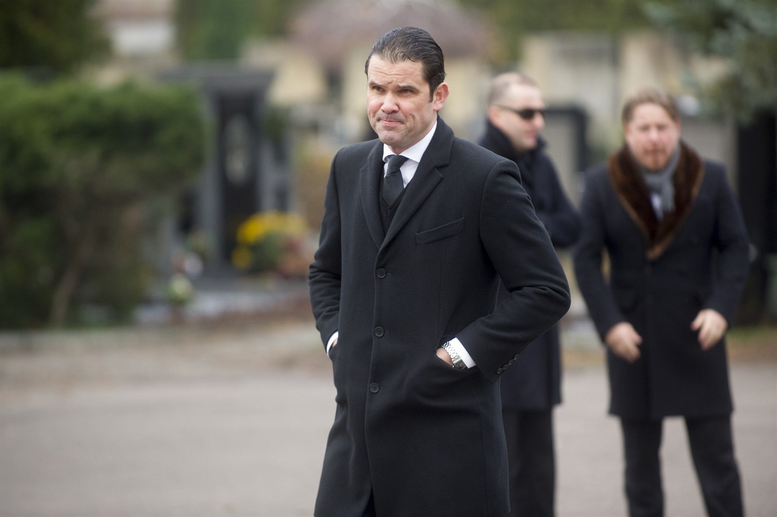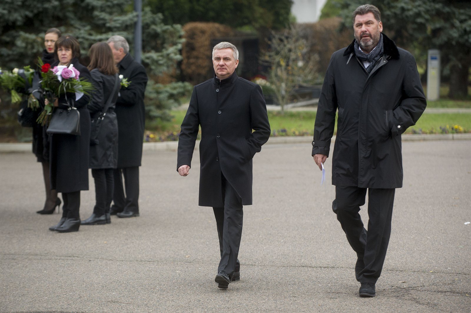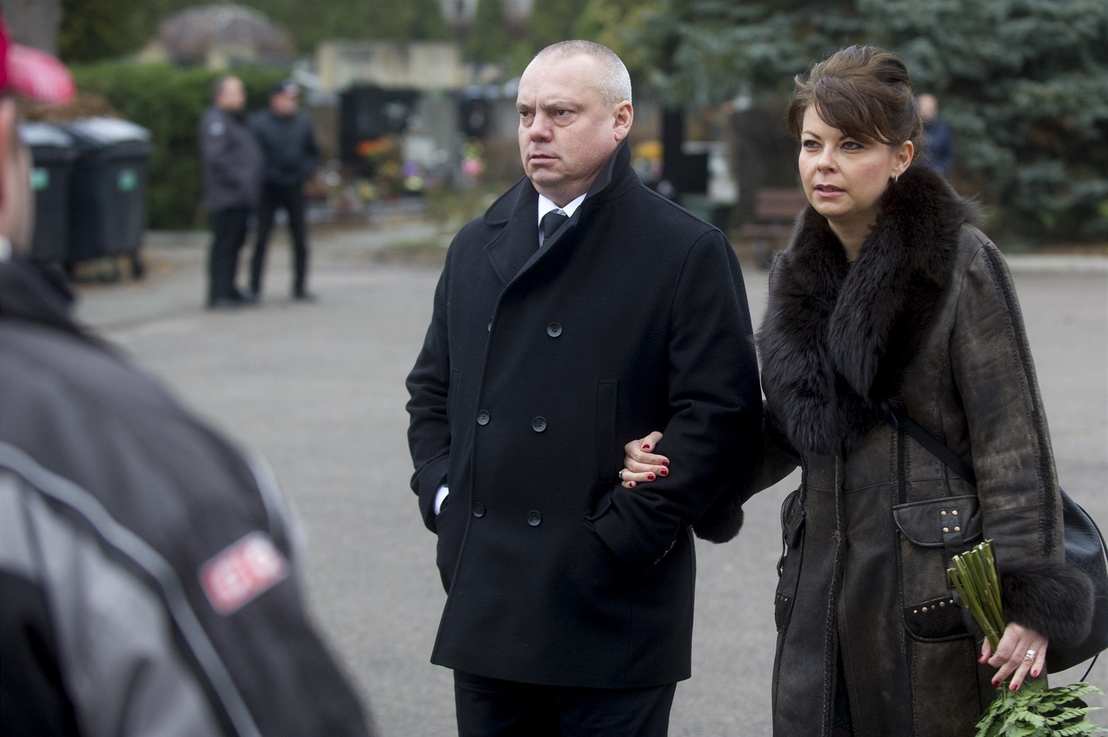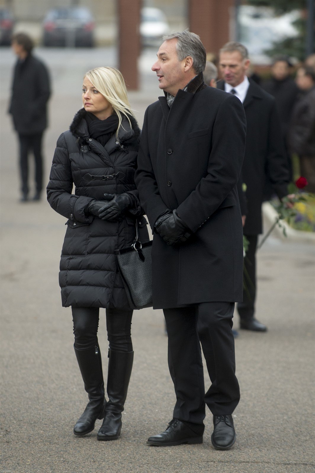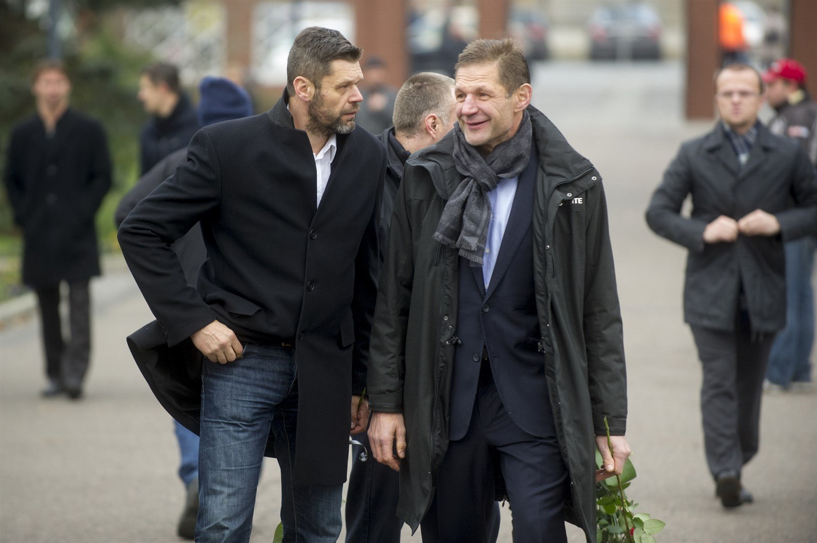 Bývalý pardubický hokejista Tomáš Blažek (vlevo) a pardubický podnikatel Michal Křečan na pohřbu Zbyňka Kusého v Pardubicích.