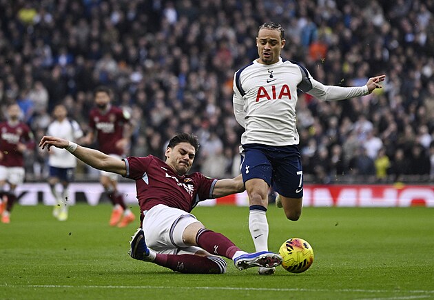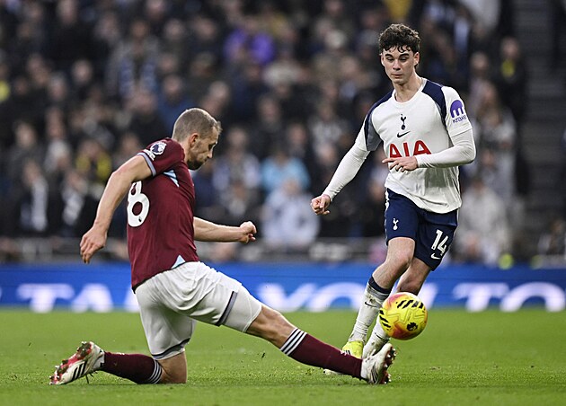 Obránce Konstantinos Mavropanos z West Hamu vypichuje míč Xavimu Simmonsovi z Tottenhamu.