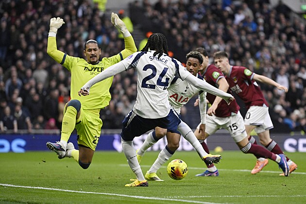 Djed Spence z Tottenhamu v šanci před brankářem Alphonsem Areolou z West Hamu