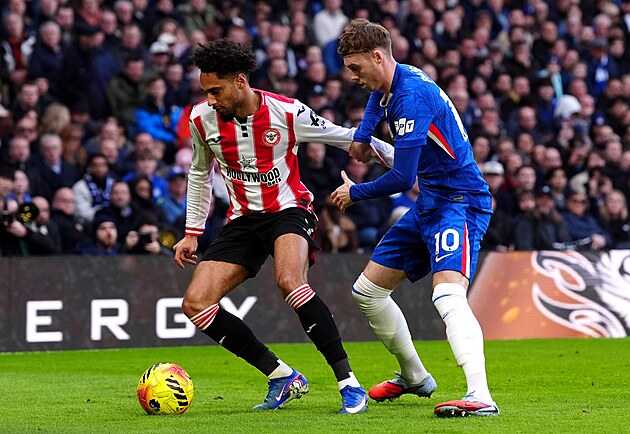 Kevin Schade z Brentfordu se snaží udržet míč před Colem Palmerem z Chelsea.