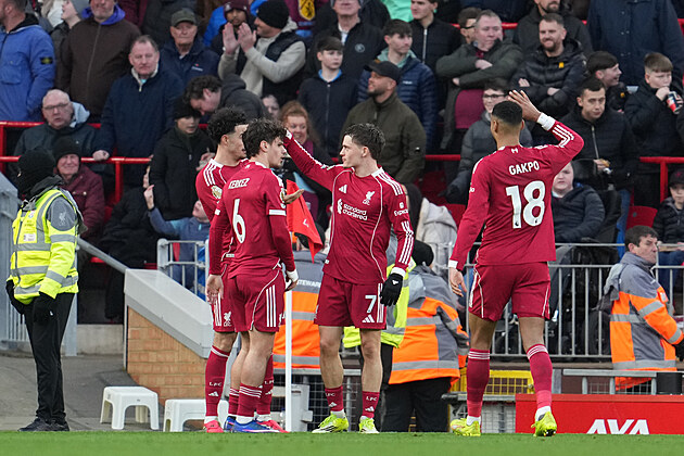 Záložník Florian Wirtz z Liverpoolu oslavuje se spoluhráči vstřelený gól.