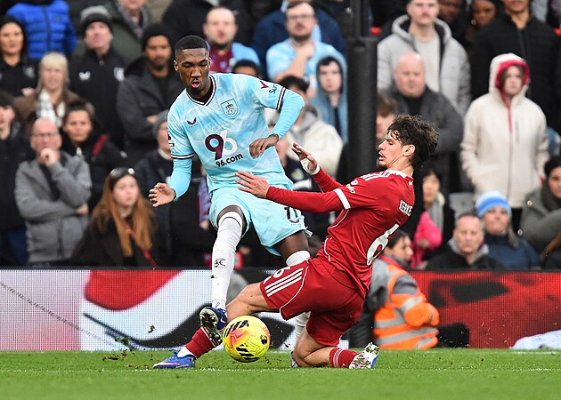 Jaidon Anthony z Burnley (vlevo) a Milos Kerkez z Liverpoolu