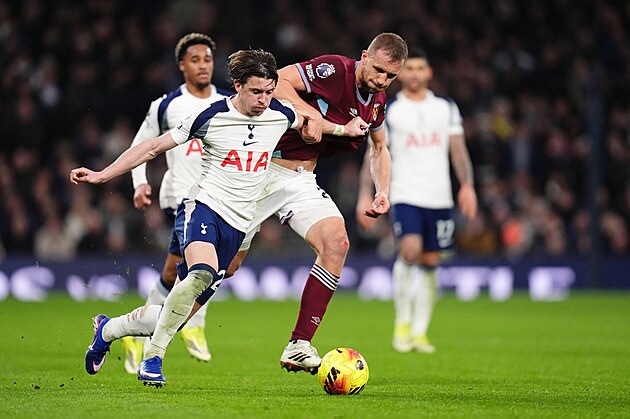 Záložník Tomáš Souček se snaží ubránit Conora Gallaghera z Tottenhamu.