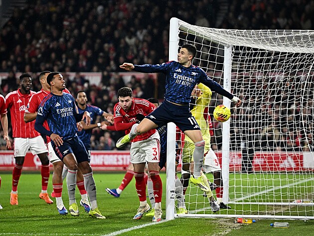 Gabriel Martinelli při standardní situaci Arsenalu v utkání proti Nottinghamu