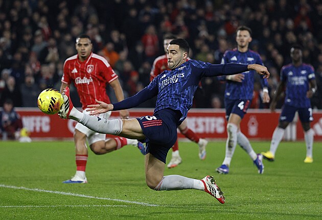 Mikel Merino z Arsenalu se natahuje po míči v utkání proti Nottinghamu.
