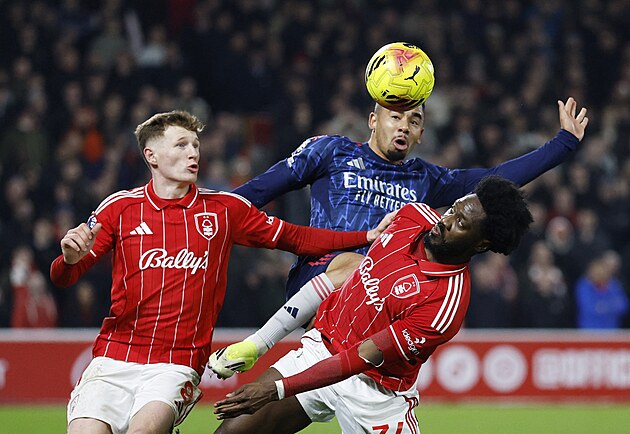 Útočník Gabriel Jesus z Arsenalu hlavičkuje v utkání proti Nottinghamu.