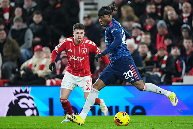 Noni Madueke z Arsenalu s míčem před Nekem Williamsem z Nottinghamu