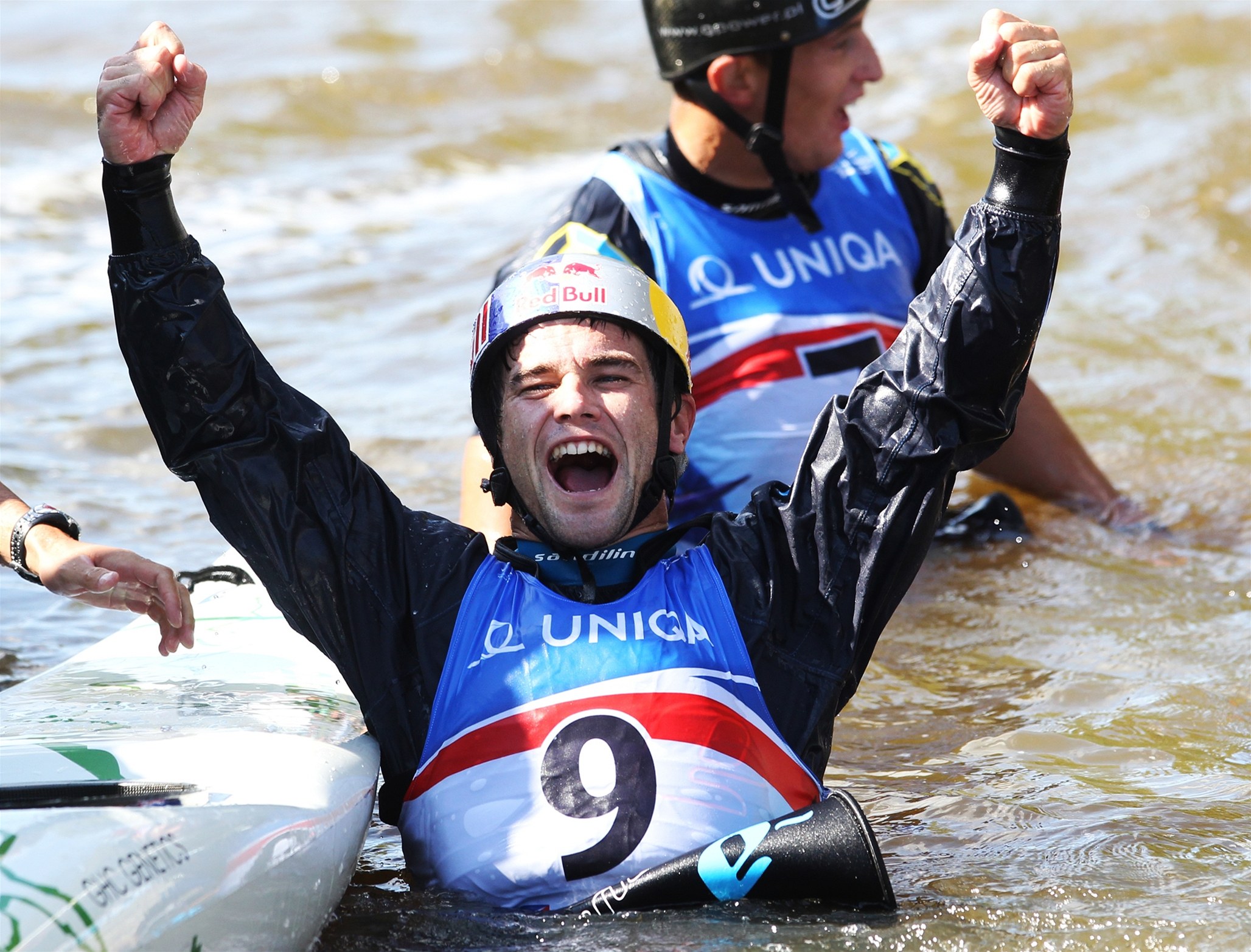 Kanoista Tomáš Rak přijímá gratulace k bronzové medaili na evropském šampionátu v Praze.