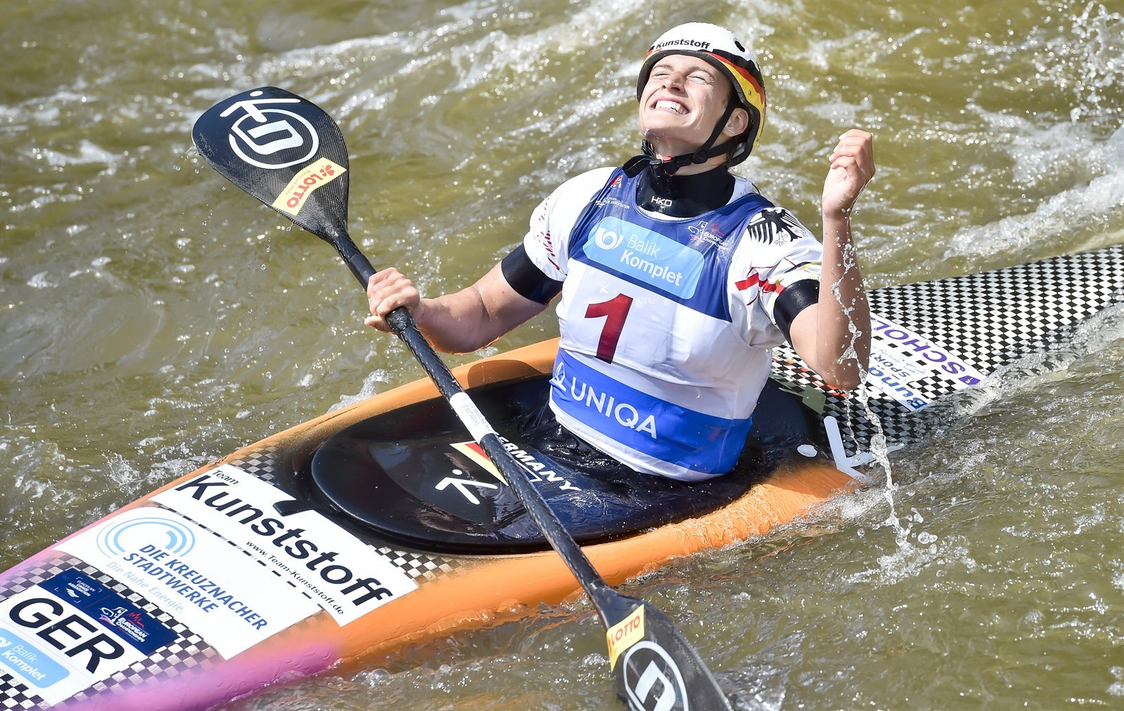 Vítězka kategorie K1 Ricarda Funková z Německa v cíli na evropském šampionátu v Praze.